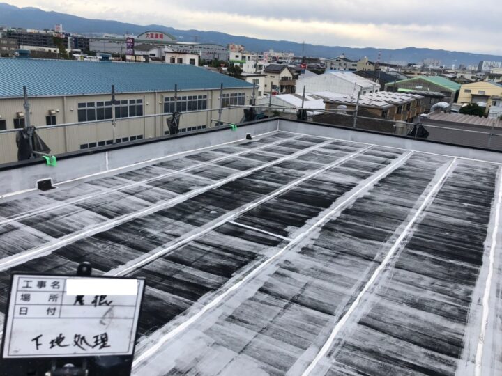 施工前に塗布してあった簡易防水のハガレや割れを処理した後、専用のシーラーを塗布し、簡易防水材2回塗りで仕上げました。