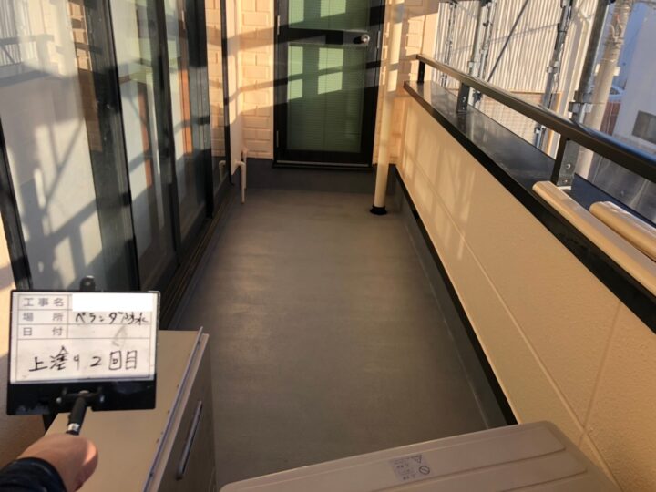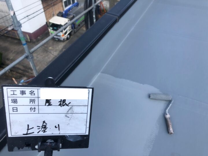 防水性能を高めるための遮熱トップコートを2回塗りで仕上げました。塗膜厚を確保するため、ムラが出ないように手塗りで丁寧に塗布しました。