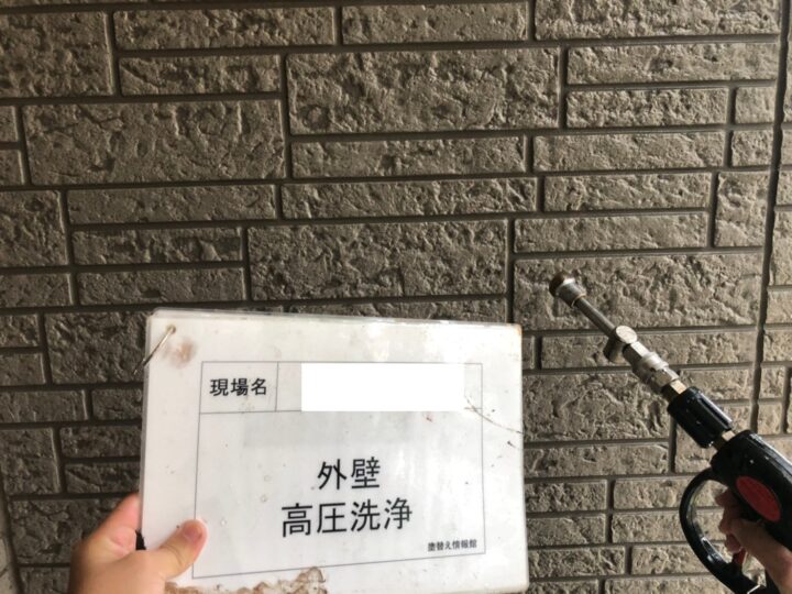 はじめに壁についた汚れを高圧の水で洗い流しました。この作業を丹念に行うことで塗装の性能が十分に発揮されます。