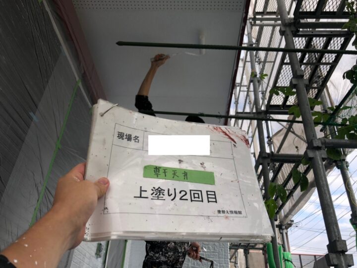 軒天井は、防カビ性能の高いNAD系塗料を2回塗りで仕上げました。