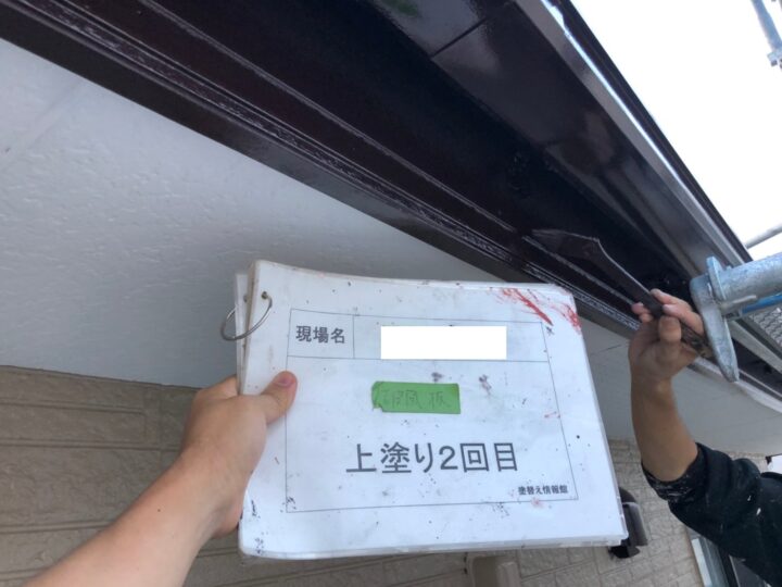 破風板も2回塗りで仕上げました。目地のシーリングも打ち替えを行い、上から塗装を行いました。