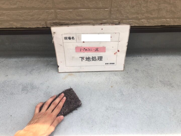 バルコニー床を掃除後、アセトンで既存防水層の表面を拭きました。この処理により塗料の密着度を高めます。