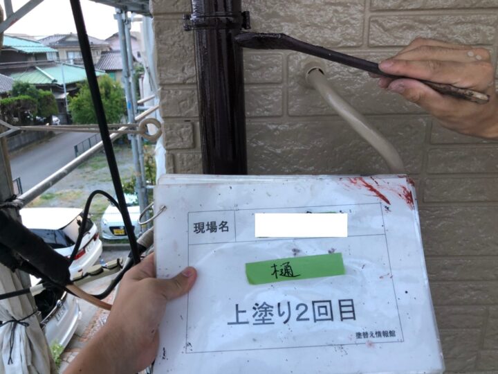 雨樋は、下地処理と上塗り2回で塗装をしました。吊金具には錆止め塗料を塗布しました。