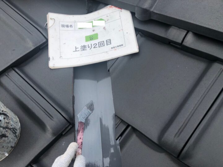 陶器瓦屋根は塗装は行いません。しかし、板金部分である谷は、錆による雨漏りのリスクを最大限抑えるため、錆止め塗料を塗布し、上塗り2回で仕上げました。