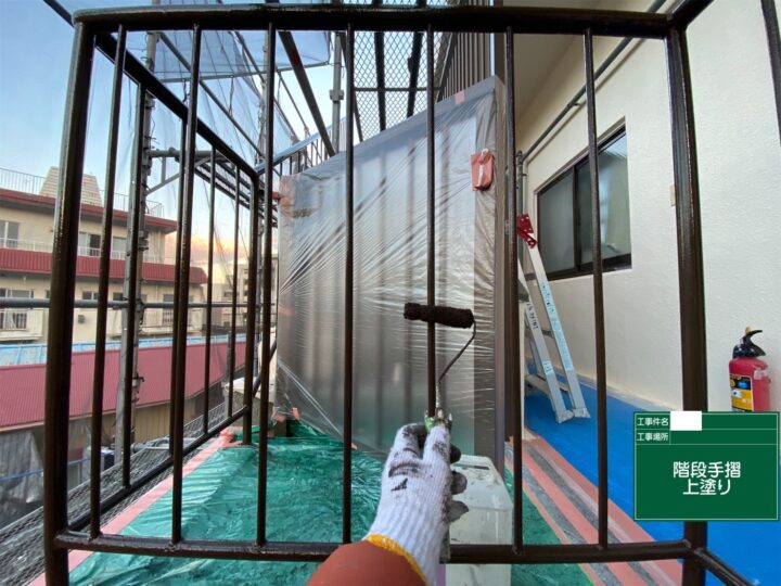 鉄製の階段手摺も、下地処理、錆止め、上塗り2回で塗装しました。