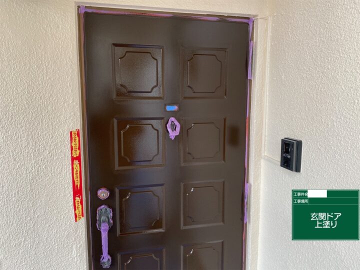 玄関ドアも下地処理を行い、下塗り、上塗り2回で塗装しました。