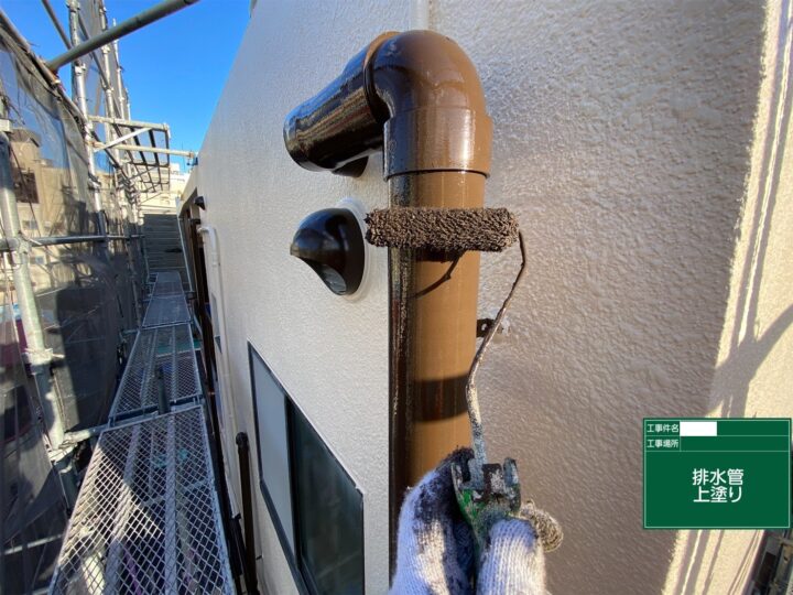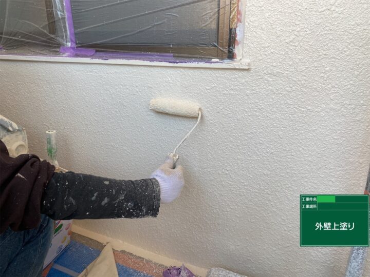中塗り後、上塗りを行いました。外壁最終仕上げの工程です。乾燥時間をしっかりと確保することが大切です。