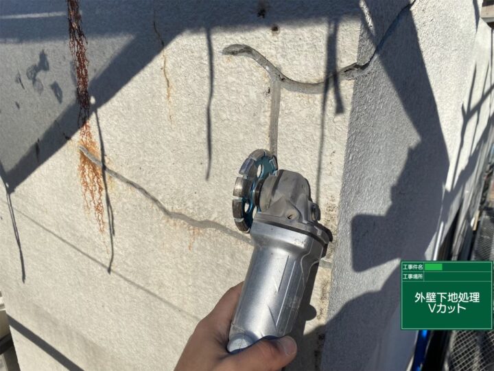 下地処理として、大きなクラック(ひび割れ)にVカット工法を使用しました。Vカット後、密着を高めるためにプライマーを塗り、シーリングを充慎し補修しました。