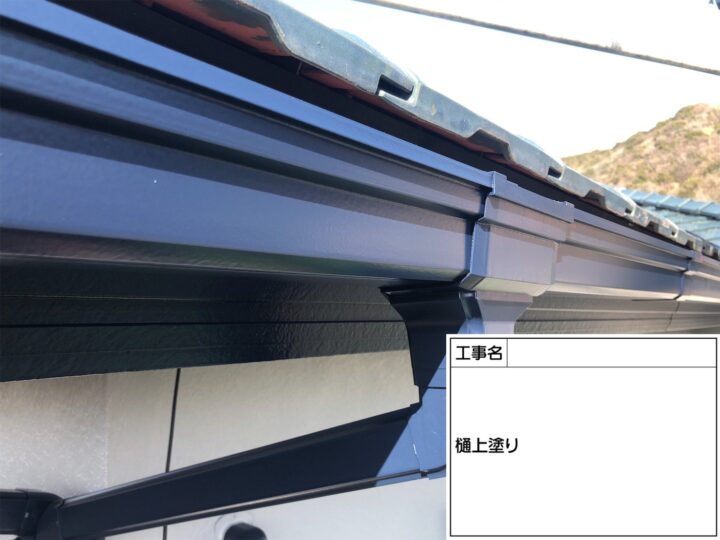雨樋は、下地処理と上塗り2回で塗装をしました。吊金具には錆止め塗料を塗布しました。