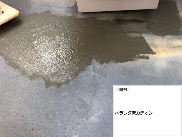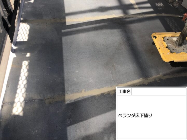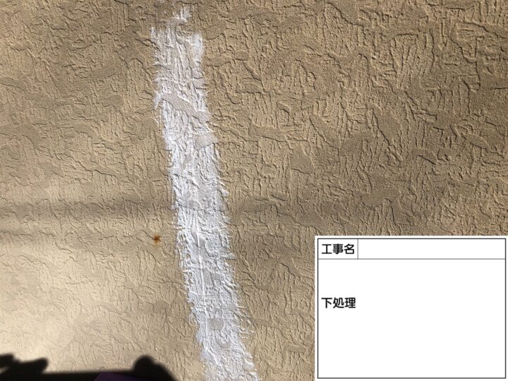 下塗り前にカチオンを塗ることで、下地調整を行いました。膨れや剥がれの防止につながる工程です。