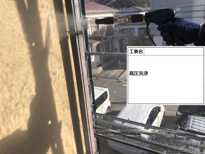 はじめに壁や床についた汚れを高圧の水で洗い流しました。この作業を丹念に行うことで塗装の性能が十分に発揮されます。