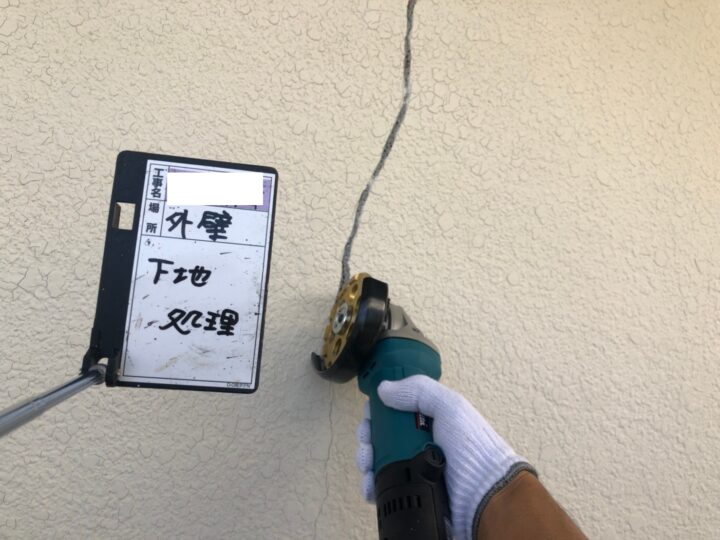 大きなクラック(ひび割れ)にVカット工法を使用しました。その後、密着を高めるためにプライマーを塗り、シーリングを充慎し補修しました。