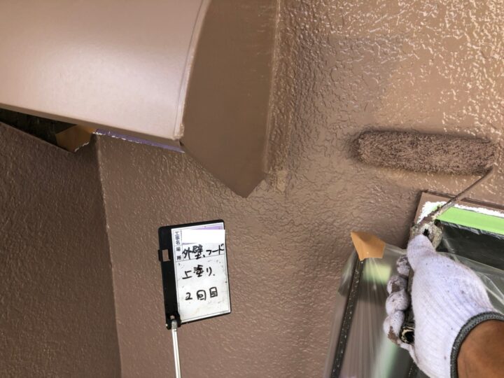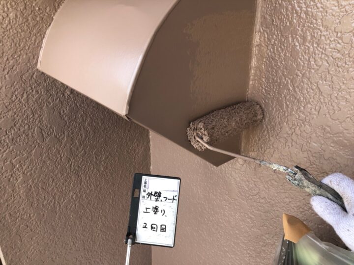 換気フードも、錆止めを塗り、上塗り2回で仕上げました。外壁と同じ色で塗り、まとまりのある仕上がりとなりました。