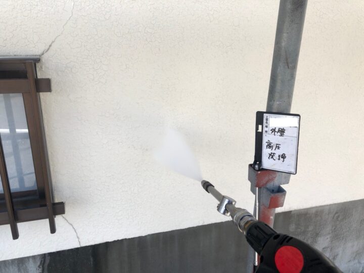塗装前には入念に高圧洗浄を行いました。苔や塗膜剥離なども落とします。