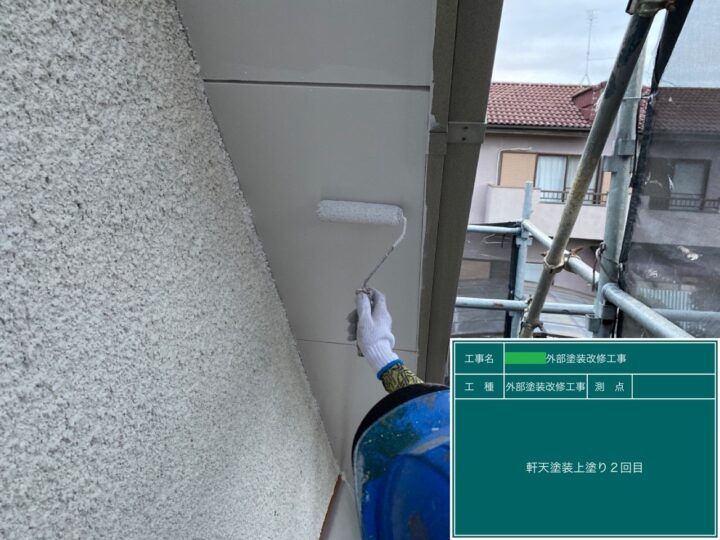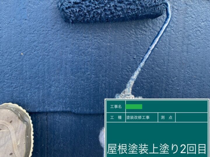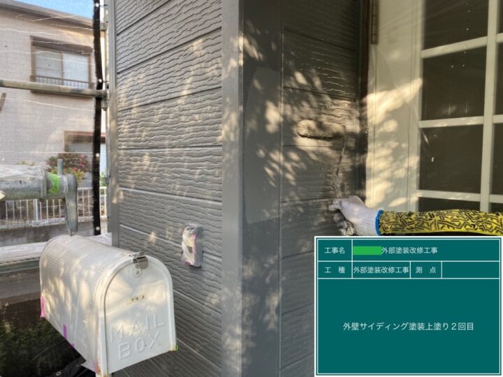 3回塗りが基本で、外壁塗装の最終工程です。上塗りは塗膜厚の確保のために、ムラなく丁寧に塗装を行いました。