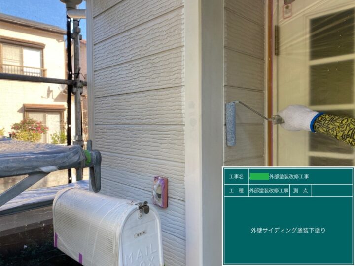 クラック(ひび割れ)をシーリング補修等の下地処理後、中塗り塗料の密着性を高めるために、下塗りを隅々までムラなく行いました。