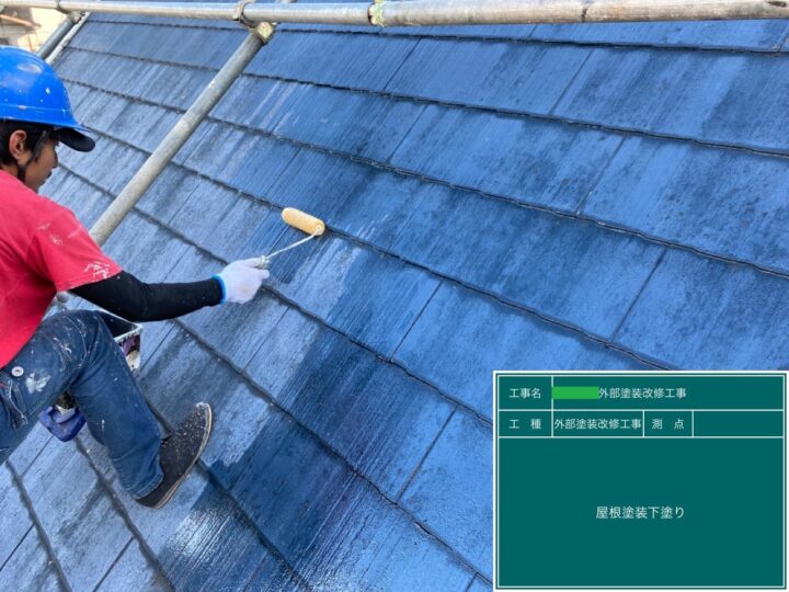 下地処理が終わったあと、下塗りとして鉄部には錆止めを入れ、屋根材にはシーラーを塗布しました。
