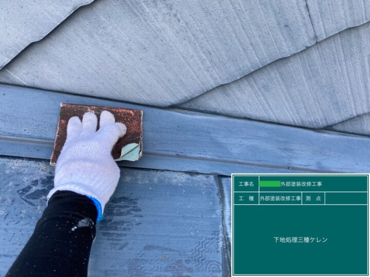 下地処理では高圧洗浄では落とせなかった汚れの除去や鉄部の足付けを、紙やすりなどでしっかり行いました。
