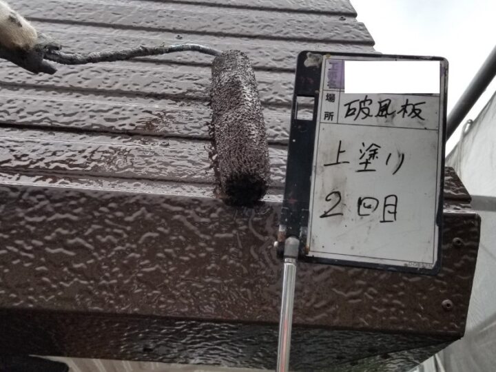鋼板製の破風板は、錆防止・密着性の向上のため、目荒らしをし、錆止めを塗り、上塗り2回で仕上げました。