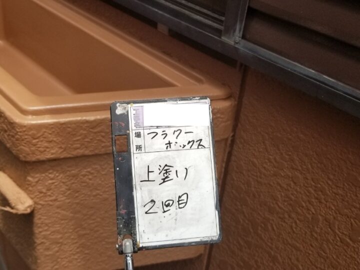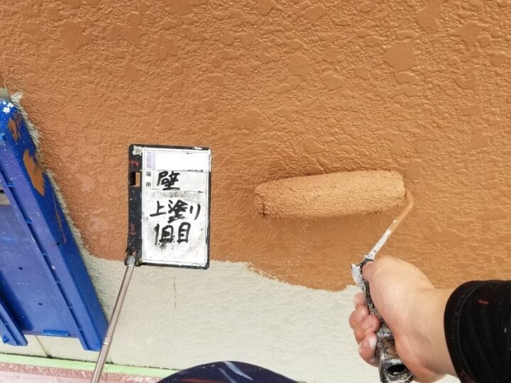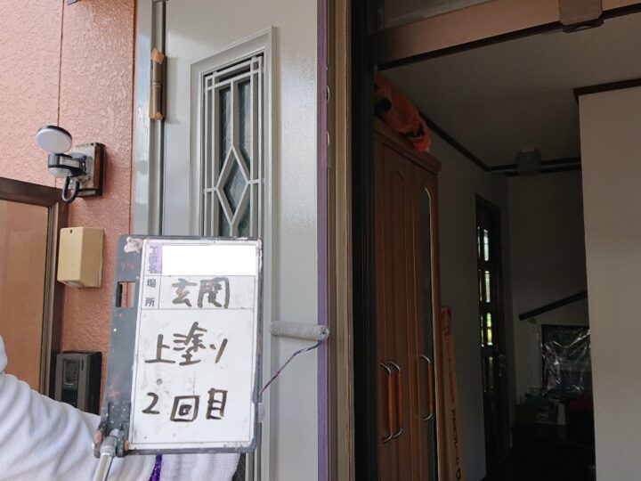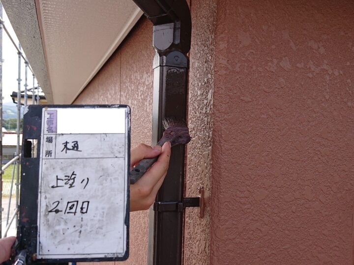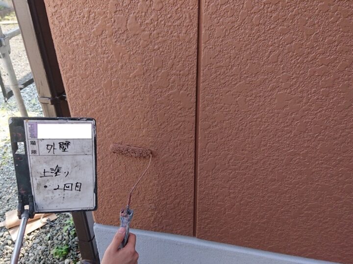 外壁塗装の最後の工程である、上塗り2回目を行いました。塗膜厚を確保するため、丁寧に行いました。