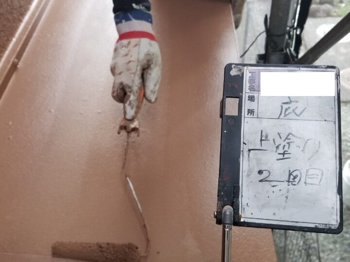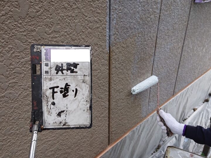 ガスケット目地の可塑剤移行防止プライマーを塗布したり、ひび割れ等のシーリング補修等下地処理をしっかり行った後、下塗りを行いました。下塗りを丁寧に行うことで中塗り塗料との密着度を高めます。