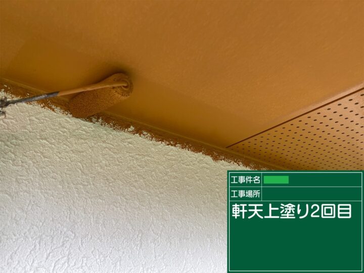 ケイ酸カルシウム板の軒天井は、防カビ性やヤニ止め効果の高い、高密着性NAD系艶消し塗料を2回塗で仕上げました。