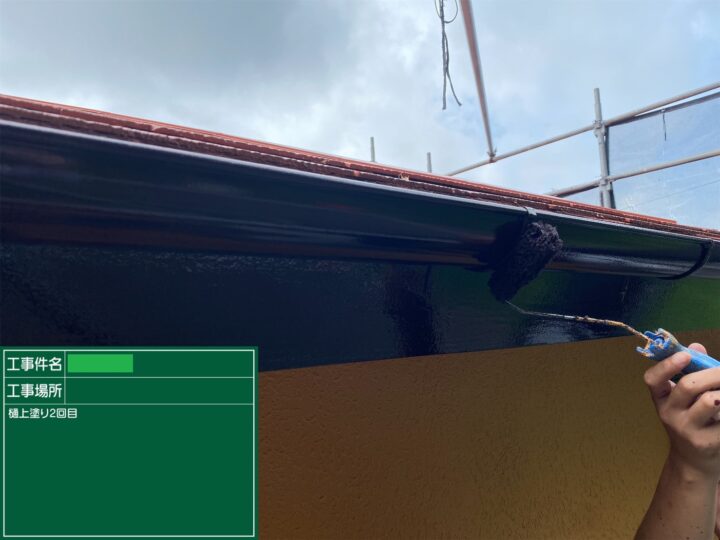 洗浄時に樋の中のコケやカビをしっかり取り除いたあと、上塗りを2回塗りで仕上げました。