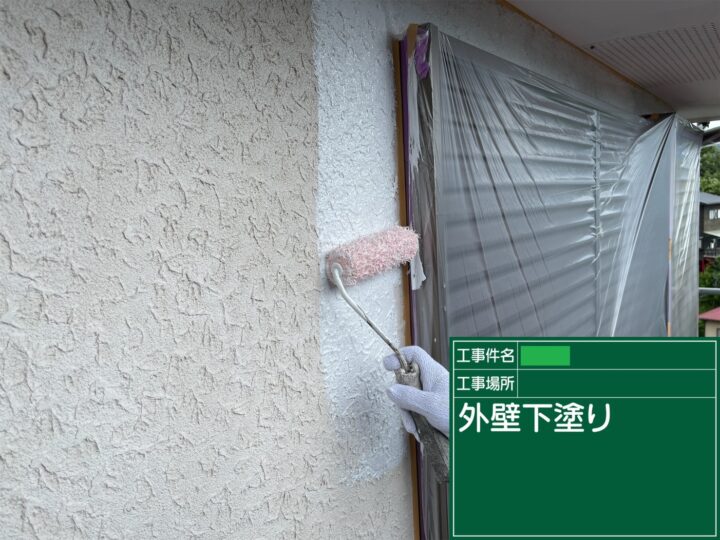下地処理での凸凹を下塗りで平坦にし、その後の中塗りと上塗り塗料が密着しやすい壁を作りました。