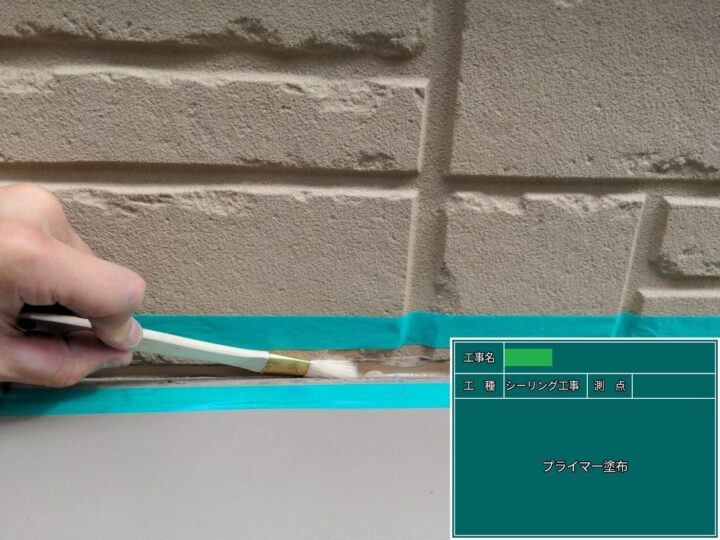 マスキングテープで養生した後、施工するシーリング材が剥離しないように丁寧にプライマーを塗りました。