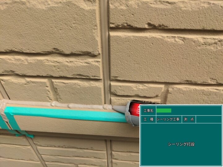 プライマーを塗布した後、シーリング材を打設しました。外壁塗料の耐久年数に合わせ、今回は超高耐久のオートンイクシードを使用しました。