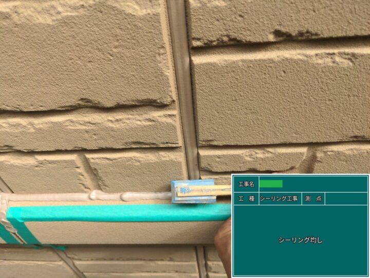 打設したシーリング材を、専用のヘラで抑えました。余分なシーリング材を除去し、表面をきれいに整えたり、密着させたりすることを目的に施工しました。
