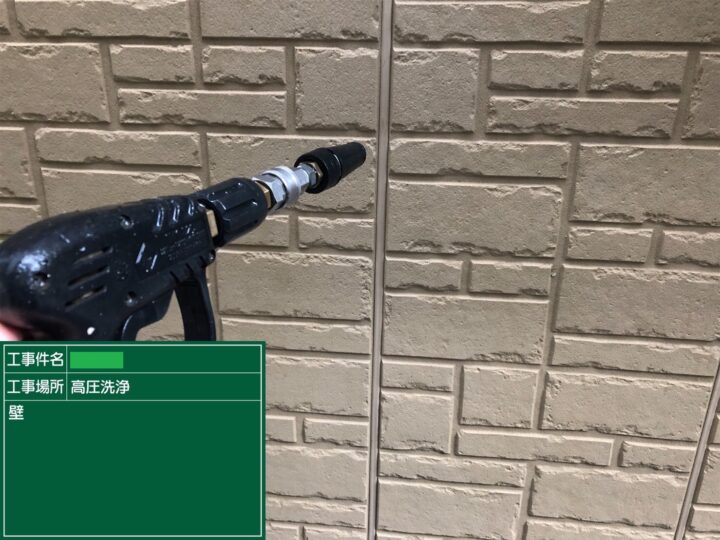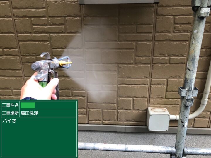 バイオ洗浄後、外壁に付着した汚れや埃等を、高圧洗浄で更に丁寧に落としていきました。
