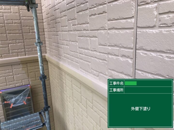 ガスケット目地の可塑剤移行防止プライマーを塗布したり、ひび割れ等のシーリング補修等下地処理をしっかり行った後、下塗りを行いました。