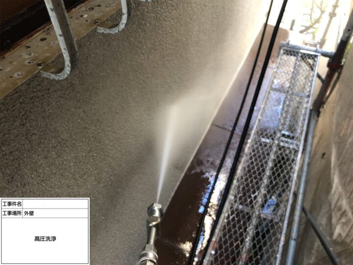 はじめに壁や床についた汚れを高圧の水で洗い流しました。