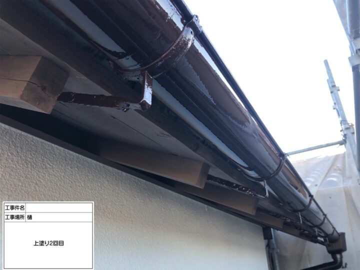 塩ビ製の雨樋は、下地処理をしっかりとし、上塗り2回で仕上げました。