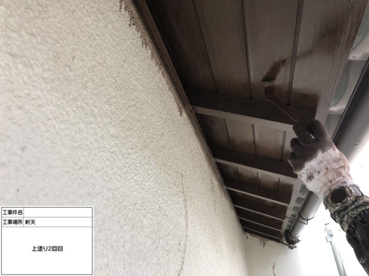 ベニヤ合板の軒天井は、防腐剤を2回塗りし、しっかりと木部を保護いたしました。