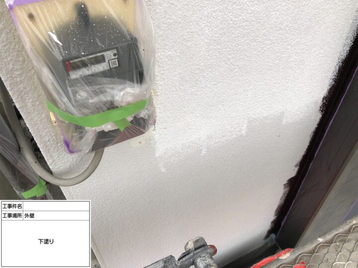 クラックをシーリングで補修する下地処理の後に、下塗りを行いました。