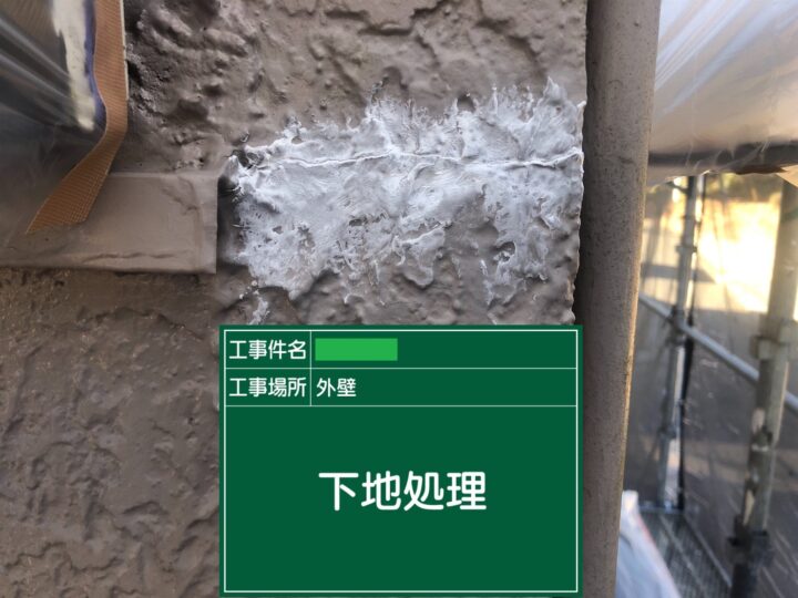 下地処理では、地震などが原因で発生するクラックをシーリングで補修したり、根強い汚れは紙やすりなどのケレンで落としていきました。