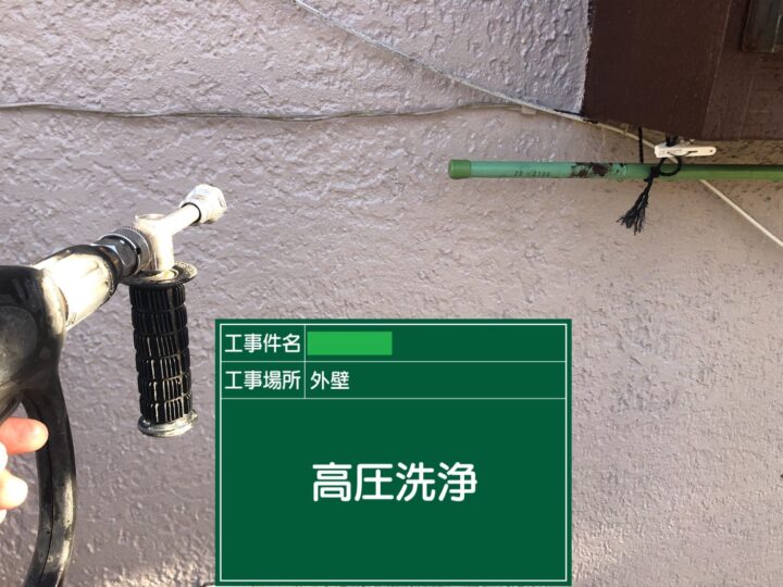 初めに、高圧洗浄機を使用し外壁の汚れやコケ等を、丁寧にしっかり落としていきました。この作業を丹念に行うことで、塗料の性能が十分に発揮されます。