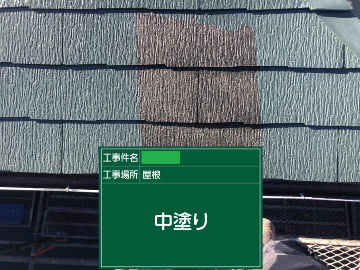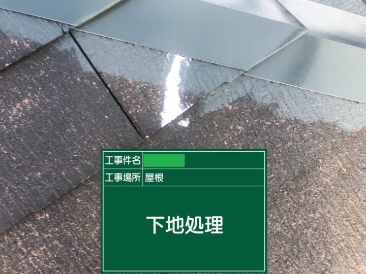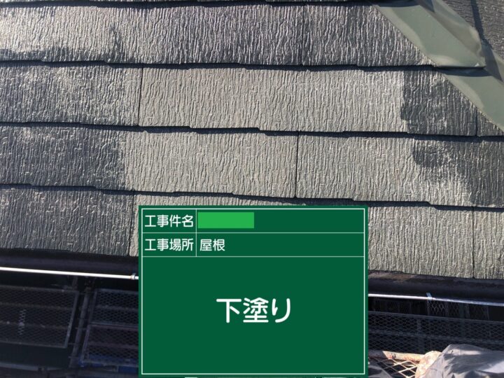屋根のスレート素材自体を強化するシーラーを塗布し、上塗り塗料との密着性を高めるの下塗りを行いました。