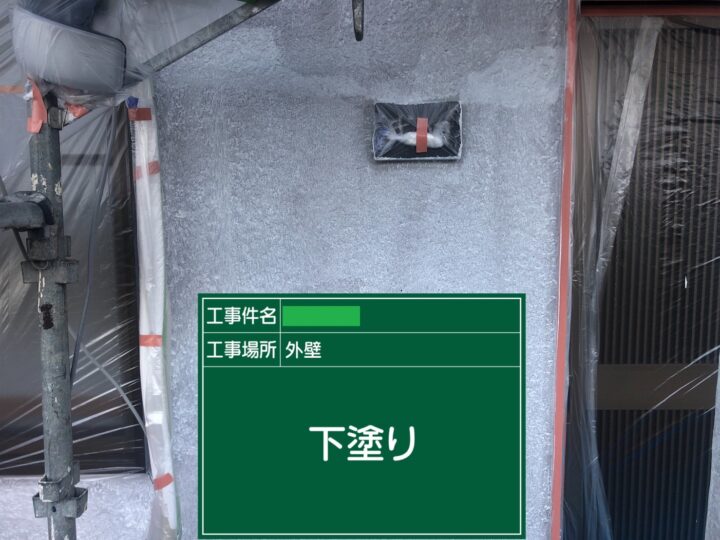 下地処理後、中塗り塗料、上塗り塗料の密着性を高めるために、下塗りを行いました。
