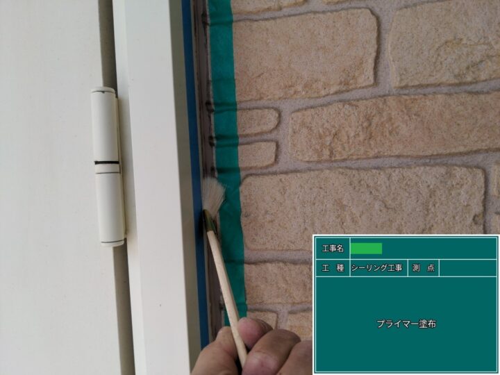 マスキングテープで養生した後、施工するシーリング材が剥離しないように丁寧にプライマーを塗りました。