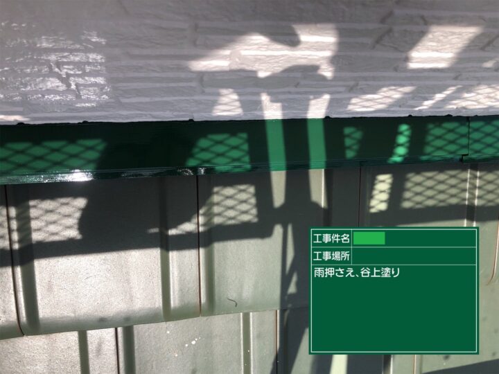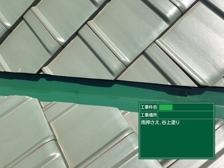 谷は板金で施工されています。退色が目立ちましたので、下地処理をして錆止め塗料を塗布し、上塗り2回で仕上げました。