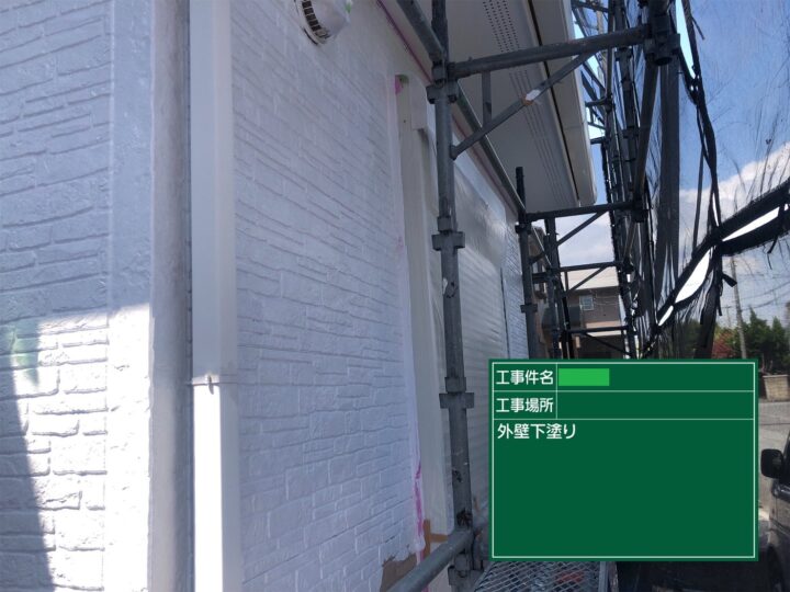 高圧洗浄である程度汚れを落としたあと、落としきれなかった汚れをペーパーケレンなどで落としていき、ひび割れなどのクラック補正等下地処理した後、下塗りへ移りました。