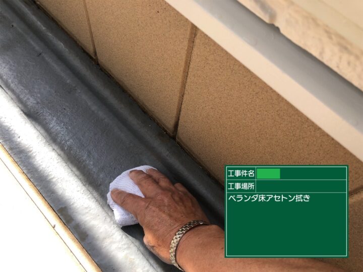 外壁同様、塗装前にあるカビ、コケなどをトルネード高圧洗浄でしっかりと汚れを落とした後、FRP防水の床の余分な油分をアセトンで丁寧に拭き取りました。