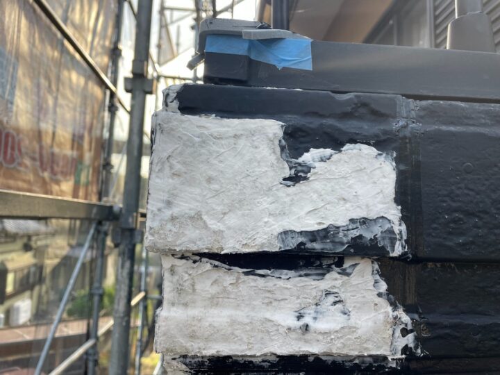 バルコニー手摺天端のジョイントも雨水の侵入経路となりうる箇所です。シーリングにて防水効果を高めます。また、シーリングに厚みを付けて耐久性を高めます。ブリッジ工法と言います。