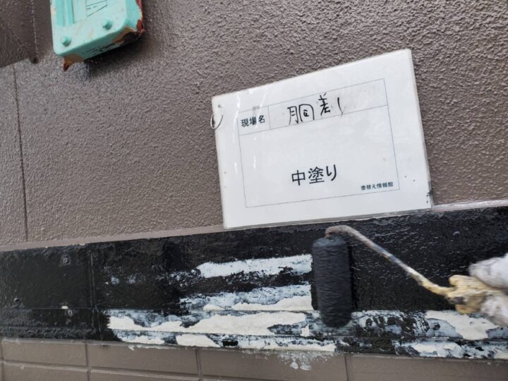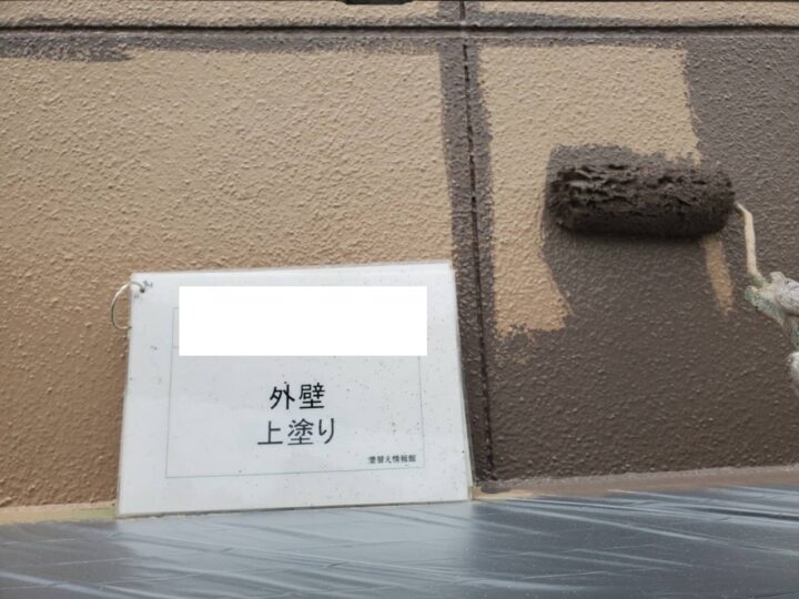 幕板は補修のパテが十分乾燥したのを確認後、下塗り、中塗り、上塗りと3階塗装で仕上げます。また、外壁の耐用年数と合わせるため、同等の塗料を使用する必要があります。今回の工事では、SK化研一液マイルドシリコンを使用します。