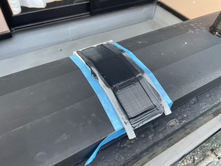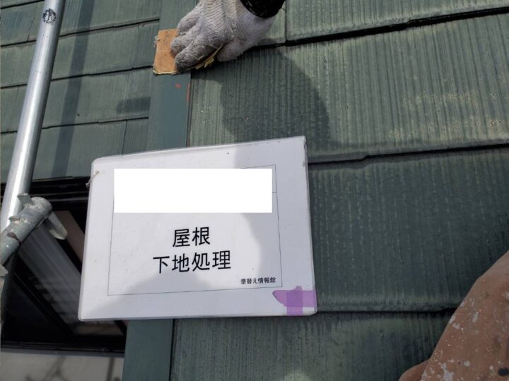 屋根はケラバ、棟など板金収めとなっています。板金部分は塗料の密着性を上げるため、下地処理にケレン(ヤスリがけ・足付け)を行います。