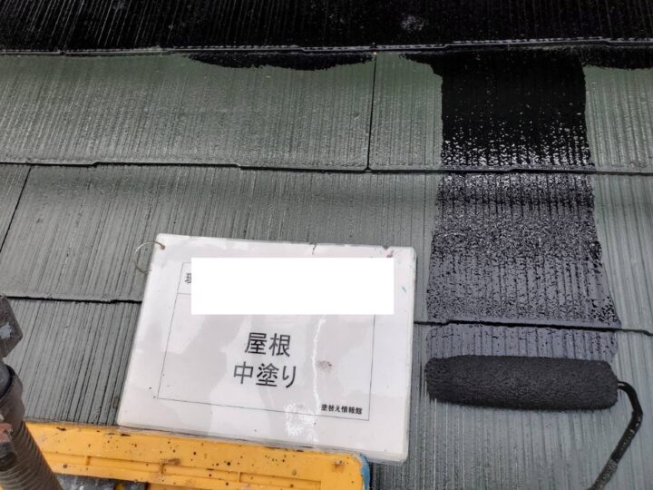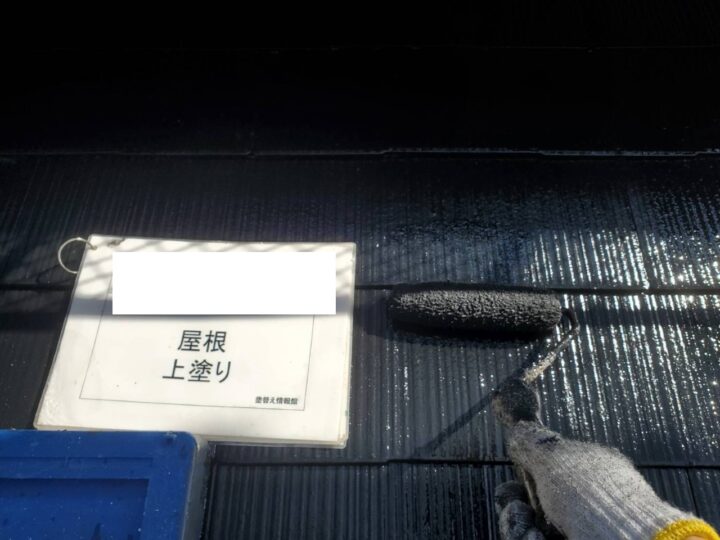 上塗りです。ムラにならないように丁寧に塗装します。また、屋根は塗料のランクを外壁よりもワンランク上げて、耐用年数を外壁と揃えるように施工します。理由は、屋根のほうが外壁より直射日光の照射量が多く、劣化が早いためです。