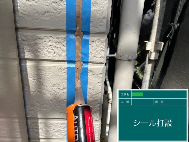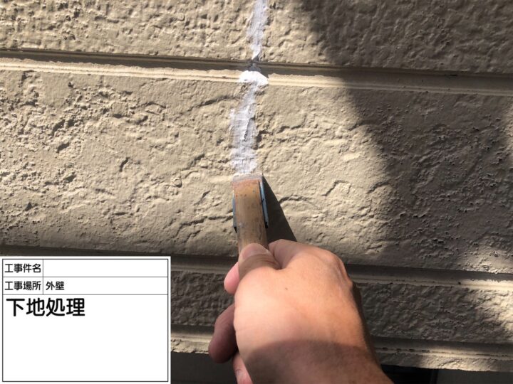 プライマーを塗布した後、シーリング材を打設しました。外壁塗料の耐久年数に合わせ、今回は超高耐久のオートンイクシードを使用しました。